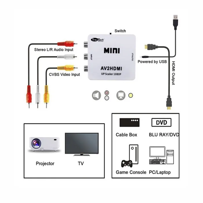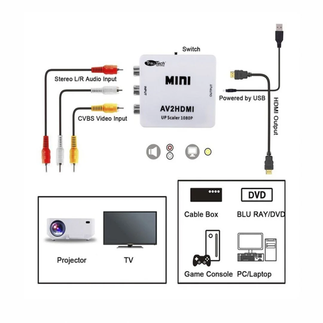 Es el dispositivo ideal para modernizar tus equipos, ya que transforma la señal analógica RCA de reproductores, consolas o televisores antiguos en una señal digital HDMI, mejorando la calidad de imagen y sonido. Es una solución universal que permite conectar fácilmente dispositivos antiguos a pantallas modernas. Soporta resoluciones de hasta 1080p (según el modelo) y se alimenta cómodamente a través de USB, garantizando una instalación sencilla y una nueva vida para tu contenido clásico.