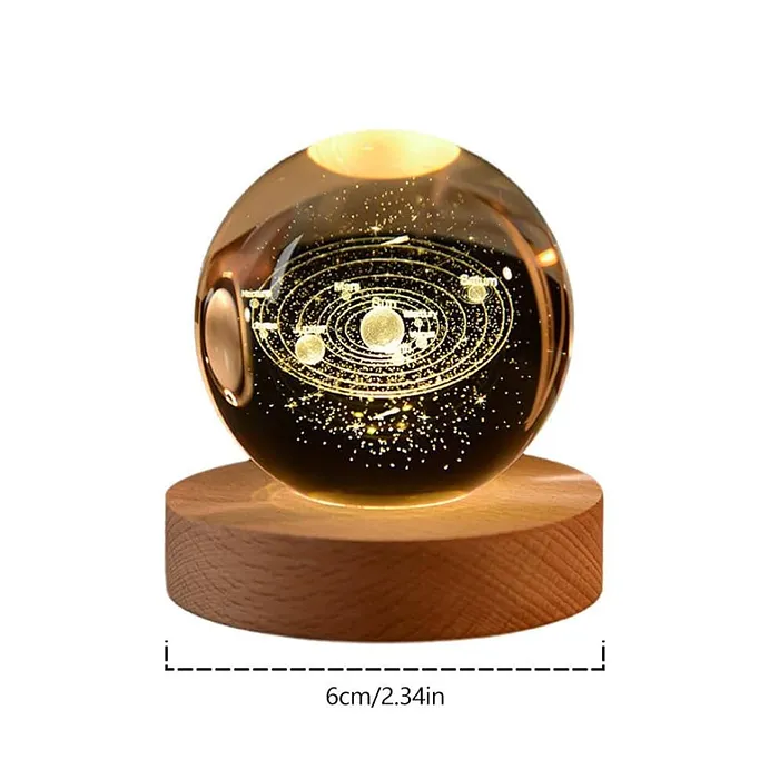 📐 Características: Diámetro de 6 cm, textura 3D con representación del sistema solar, base de soporte incluida, batería recargable, materiales livianos y resistentes.