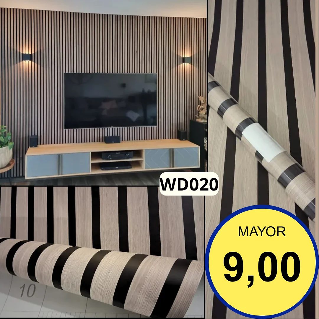 Es la solución ¡DIY! (Hazlo Tú Mismo). Su diseño rayado con textura Madera Clara y Negro es ideal para paredes de acento en salas, cuartos o cocinas. Es el Vinilo Revestimiento perfecto para una renovación rápida y sin obras. ¡Aporta elegancia moderna y textura visual al instante!